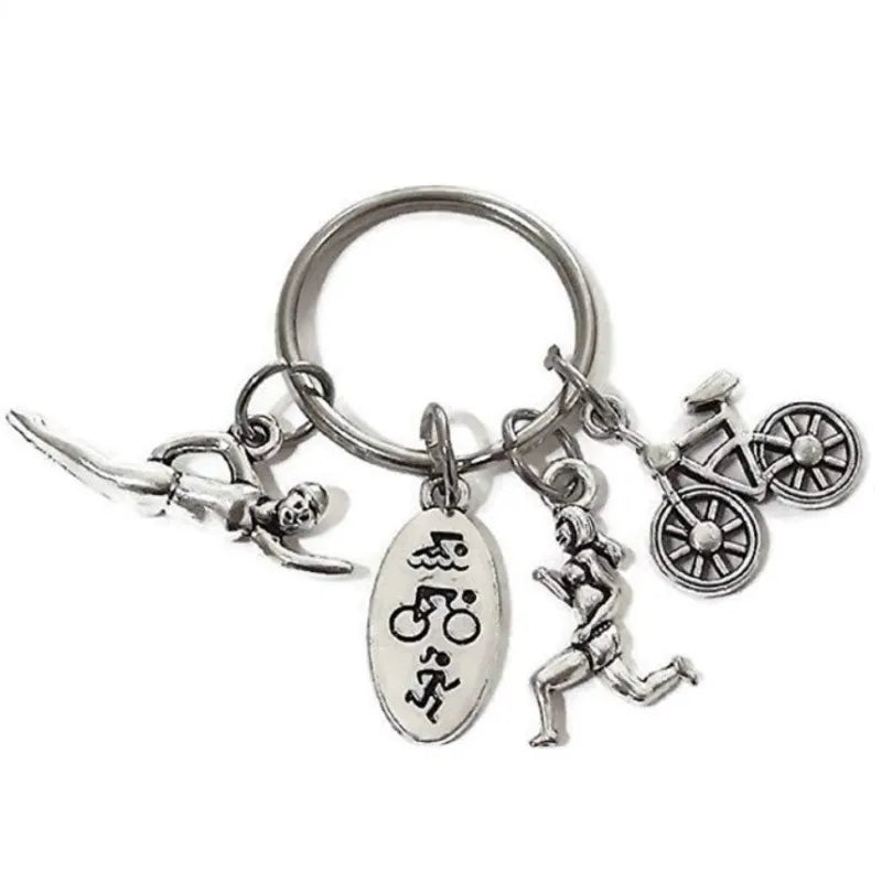 Symbolisches Design: Der Schlüsselbund verfügt über vier verschiedene, gut gefertigte Reize: einen Schwimmer im Mittelschlag, einen Radfahrer auf einem Roadbike, einen Läufer in Bewegung und einen ovalen Charme mit den offiziellen Triathlon-Ikonen.