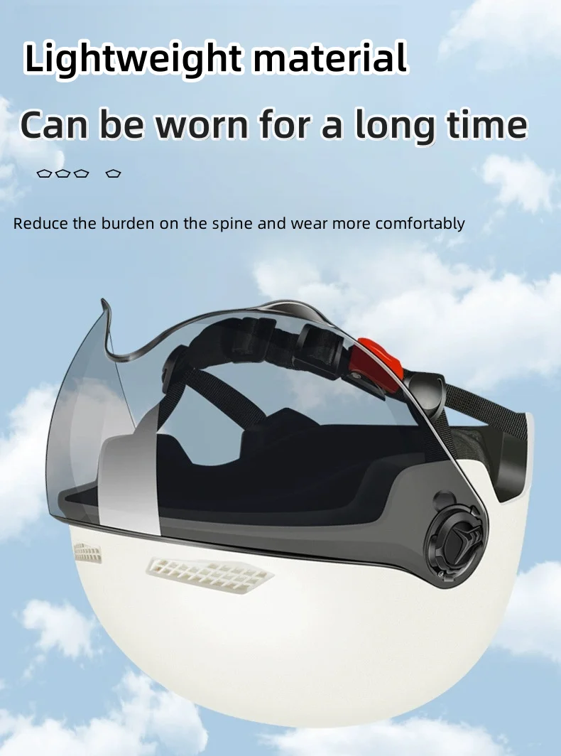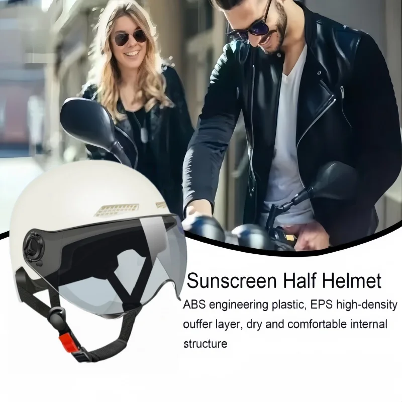 Dies ist ein vielseitiges, Halbvisierhelm Entwickelt für Motorroller, Mopeds und Motorräder für den Stadtverkehr. Er bietet eine umfassende Kopfbedeckung bei gleichzeitiger Beibehaltung eines offenen Gesichtsstils und betont eine mehrschichtige Konstruktion für mehr Sicherheit und Komfort, die als „Anti-Fall-Helm“ vermarktet wird.