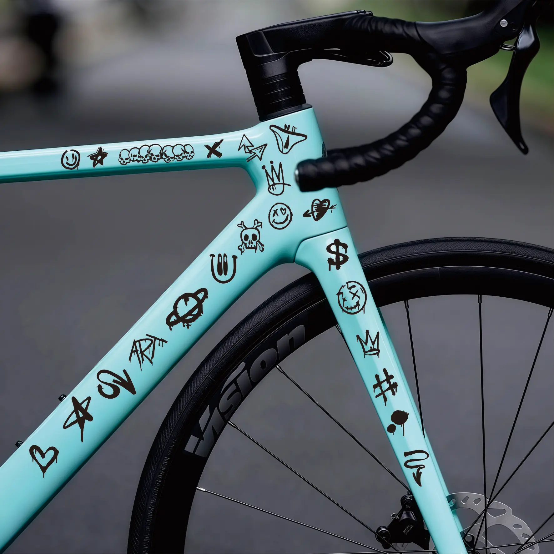 Este producto es una colección de Vinilos para bicicletas estilo graffiti urbano Diseñado para transformar tu bicicleta en una obra de arte callejera única. Estas pegatinas son el accesorio perfecto para ciclistas y ciclistas creativos que quieren expresar su personalidad y darle a su montura un aspecto atrevido y personalizado.