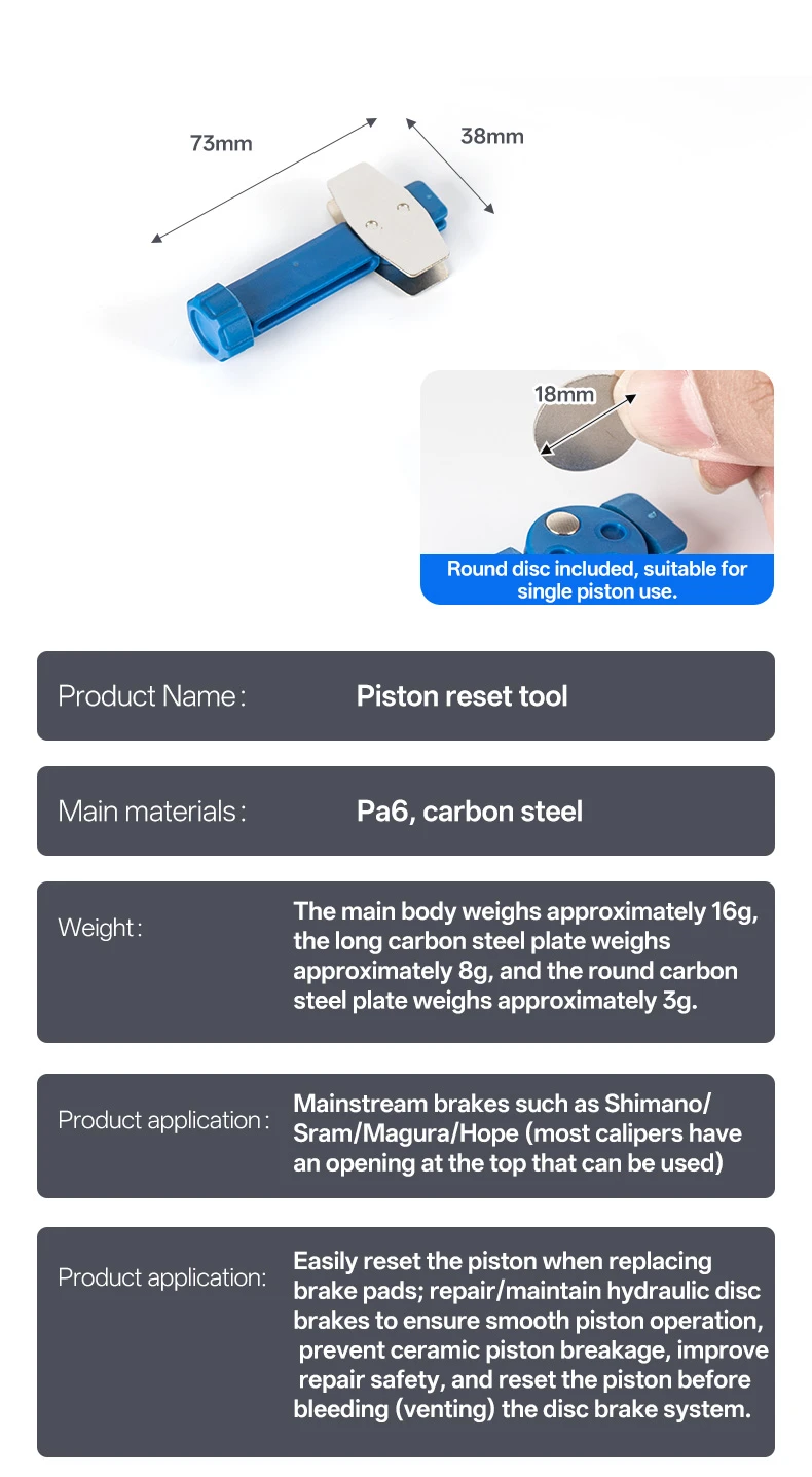 Questo strumento di ripristino del pistone del freno è un punto di svolta per i meccanici domestici e i negozi di biciclette professionali. Elimina la frustrazione e il potenziale per i danni che derivano da strumenti di fortuna, fornendo una soluzione semplice, affidabile e professionale. Per un modo efficiente per servire i freni a disco idraulico, questo strumento è un'aggiunta essenziale al kit di manutenzione.