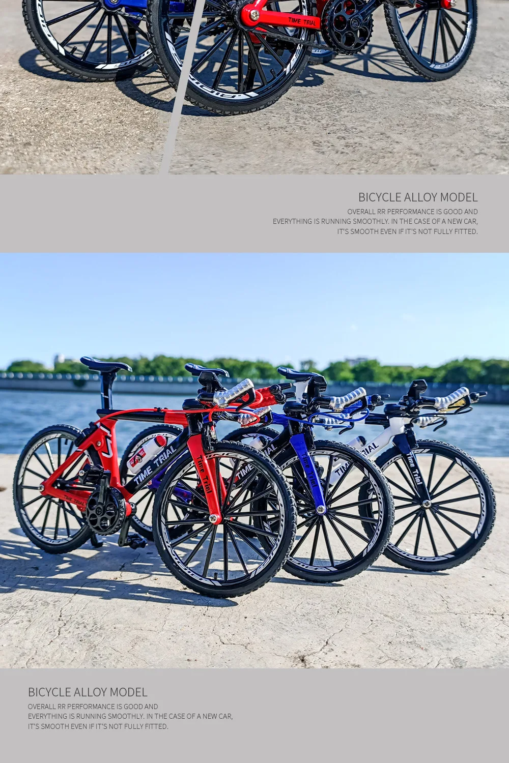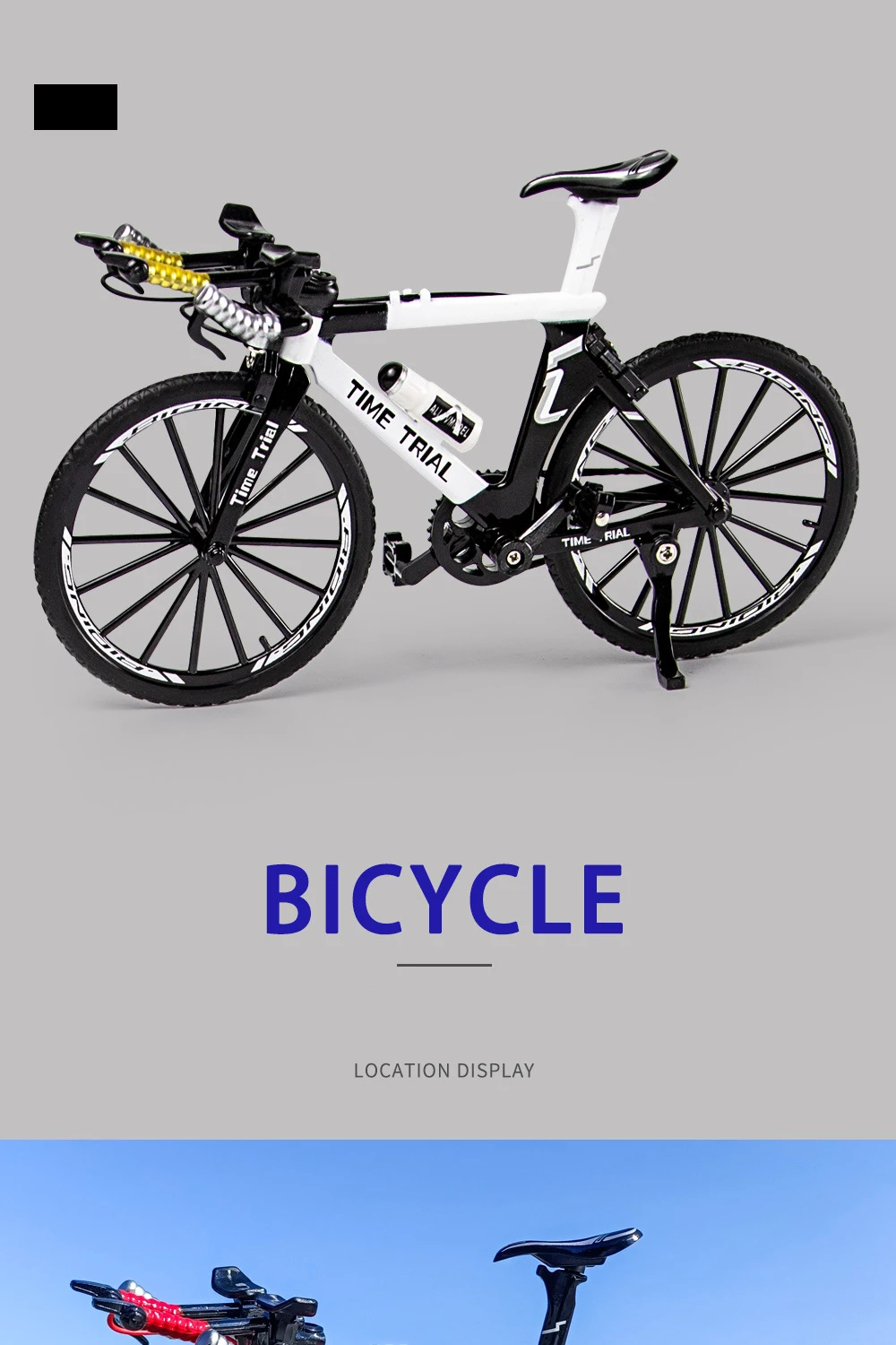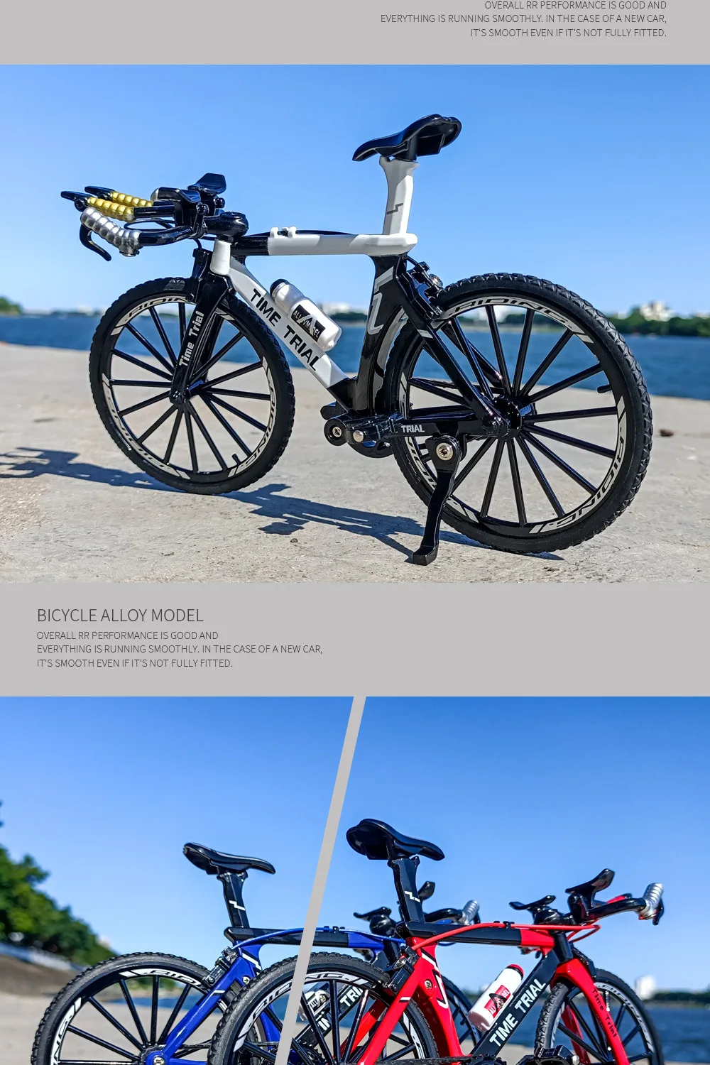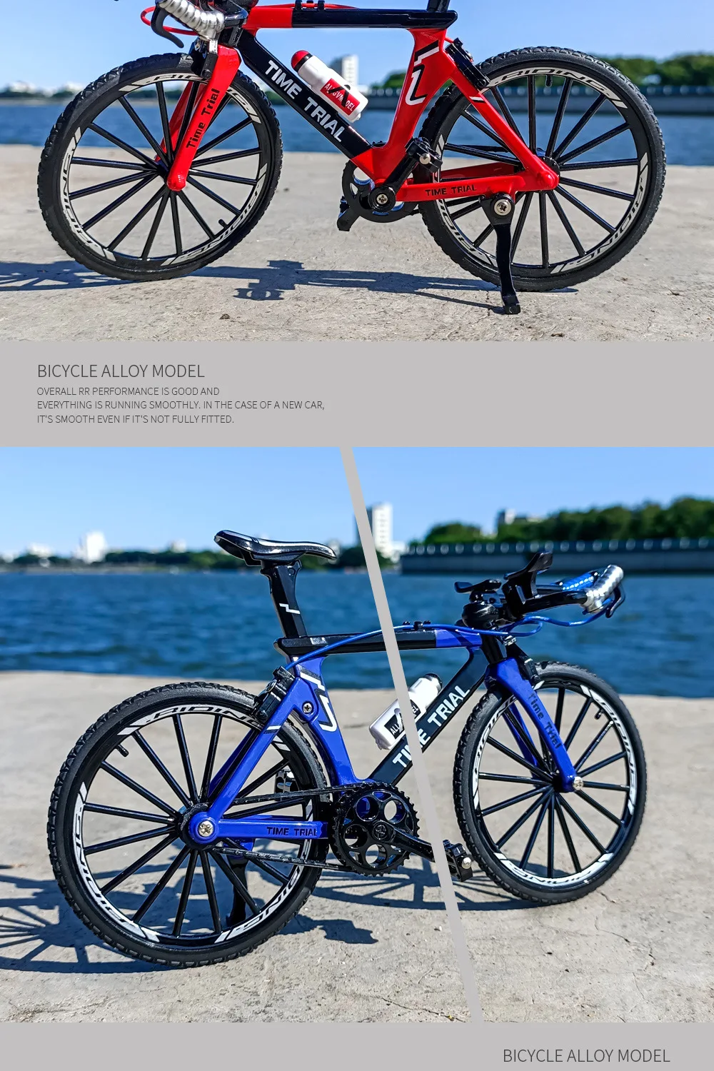 Realistic Time Trial Design: This miniature bike model is crafted with incredible attention to detail. It features a fully detailed alloy frame, a simulated seat, and a sleek aerodynamic design, mimicking the look and feel of a real time trial bike.