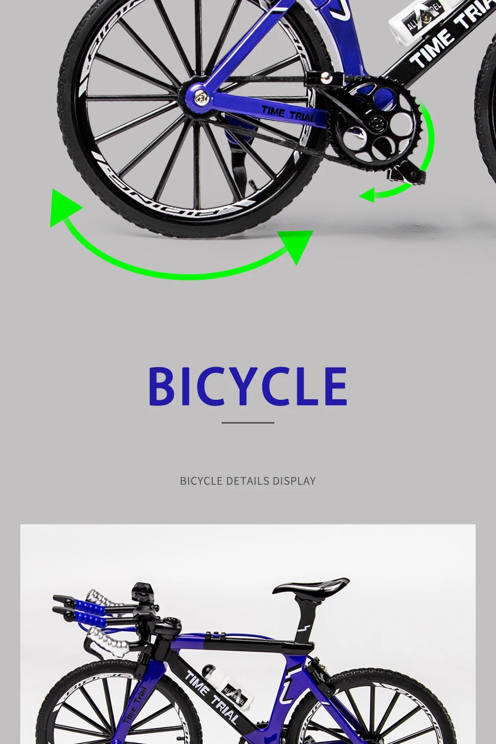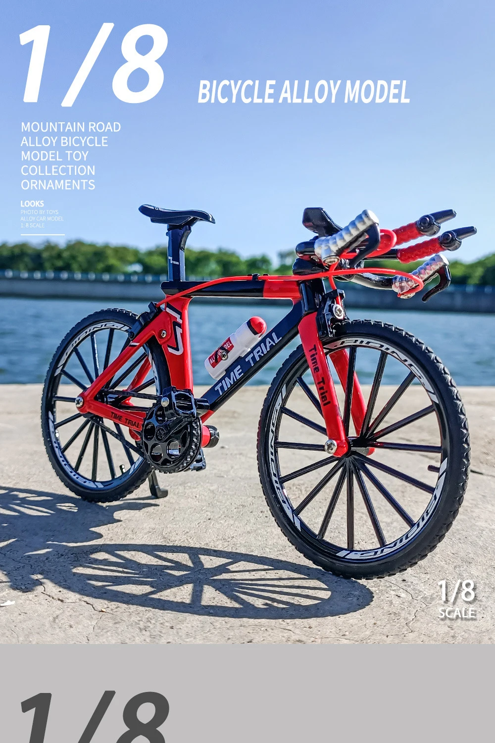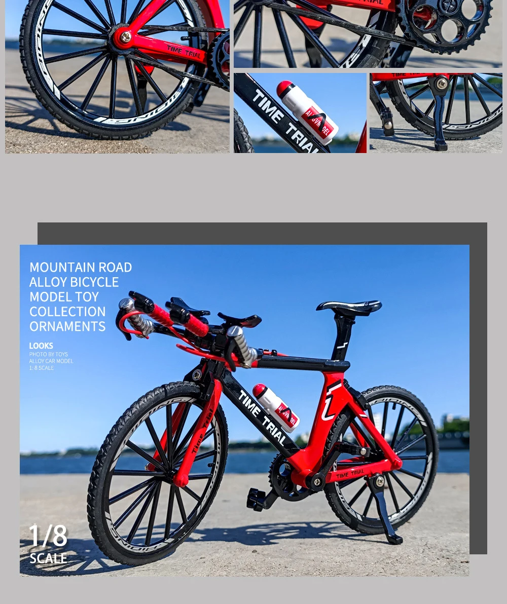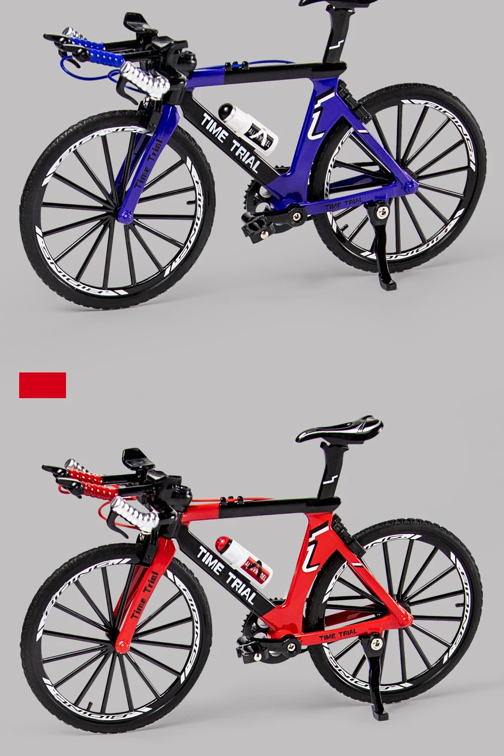 Realistic Time Trial Design: This miniature bike model is crafted with incredible attention to detail. It features a fully detailed alloy frame, a simulated seat, and a sleek aerodynamic design, mimicking the look and feel of a real time trial bike.