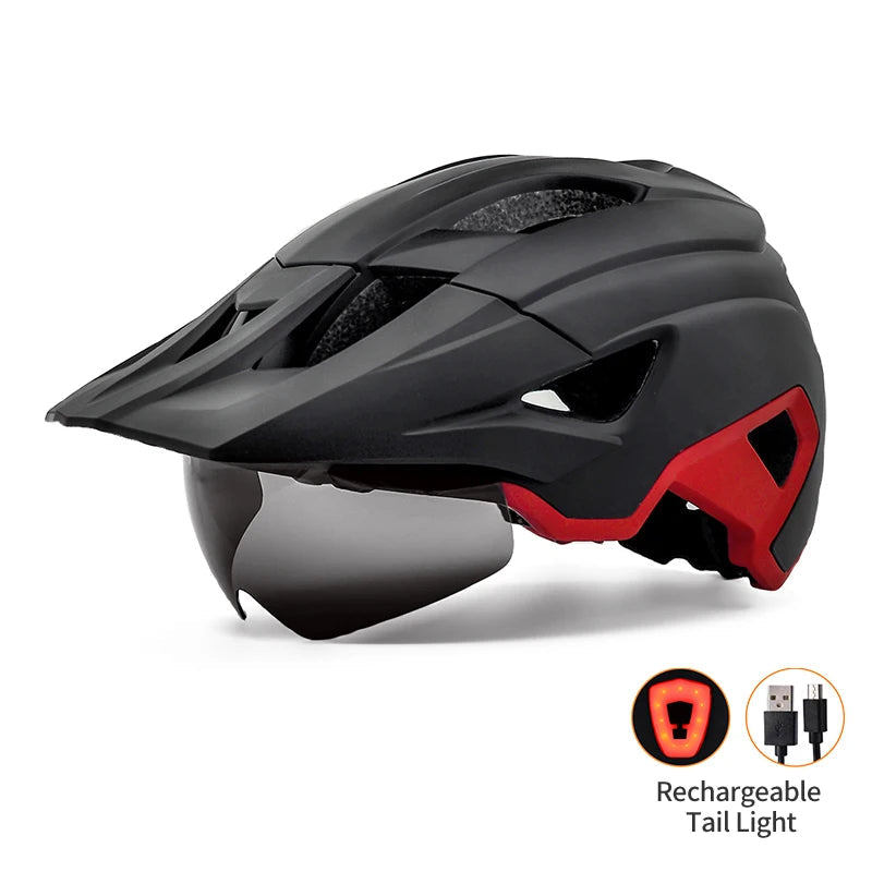 Stay protected and stylish with this Adult Helmet featuring a detachable magnetic sun goggle visor for clear visibility and UV protection. Built with a robust PC shell and high-density EPS foam, it offers superior impact absorption while remaining lightweight for long rides. The integrated rechargeable tail light provides three lighting modes—constant, slow flash, and rapid flash—for enhanced safety during night riding. Designed with excellent ventilation, it keeps airflow consistent to prevent overheating, while the adjustable fit system ensures a snug and comfortable fit for most head sizes. Perfect for road cycling, mountain biking, and urban commuting, this helmet combines versatility, safety, and modern performance.