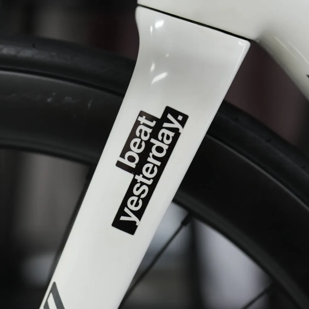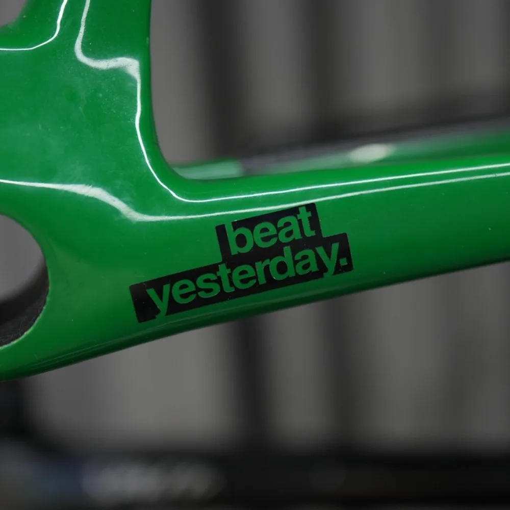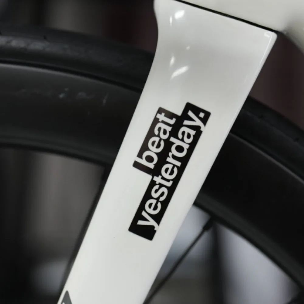 Fuel your passion and push your limits with this powerful "Beat Yesterday" Vinyl Decal. This simple yet profound sticker is more than just an accessory—it's a statement of dedication. It serves as a constant reminder to challenge yourself, strive for personal bests, and always aim for progress, whether you're training for a race or simply enjoying a ride. With its clean and bold design, it's the perfect way to add a touch of motivation to your bike.