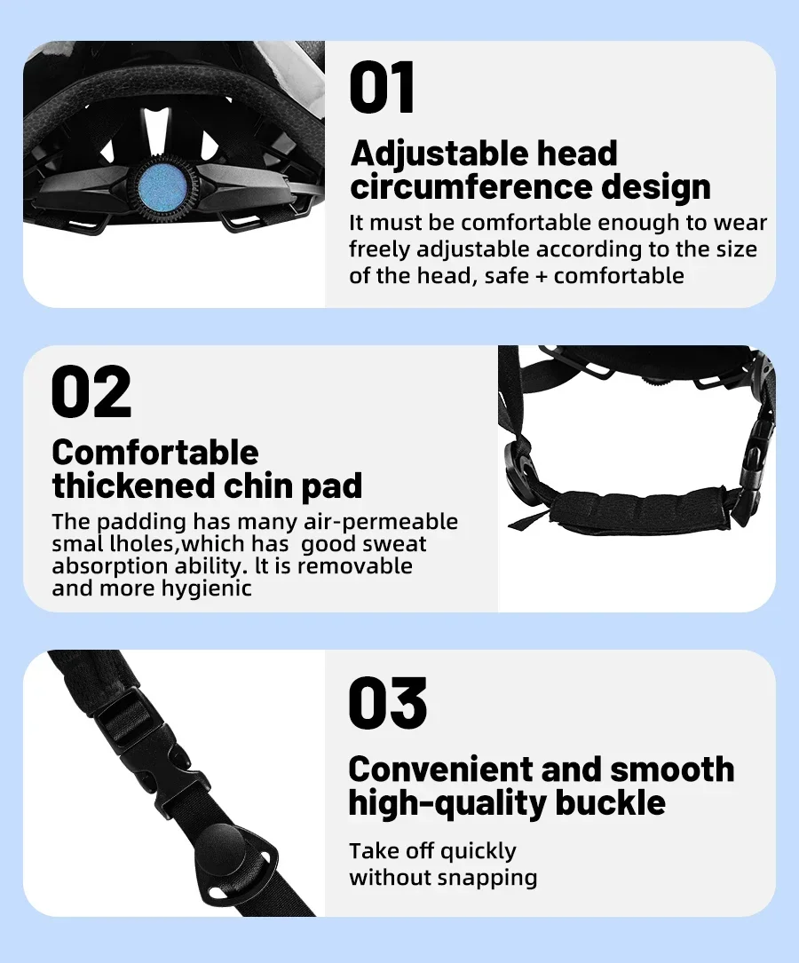 Precise Adjustment System: Features a detailed Head Circumference Adjuster (dial system) for quick and accurate sizing, along with secure Nylon Webbing straps, a Fan-shaped Buckle, and a Thick Chin Pad for comprehensive comfort and retention.