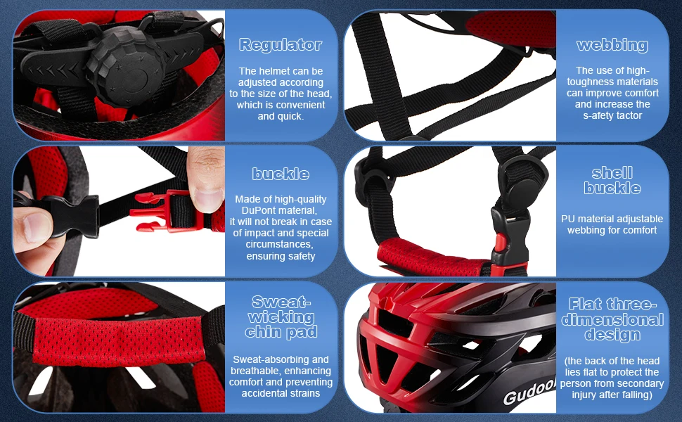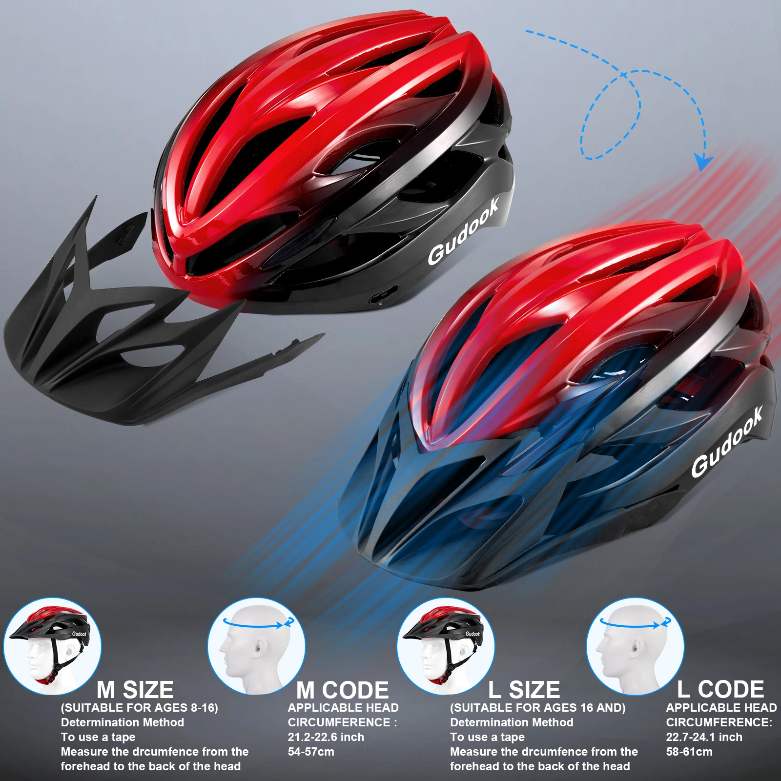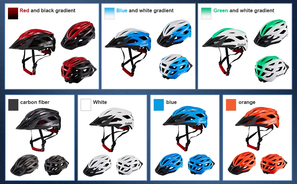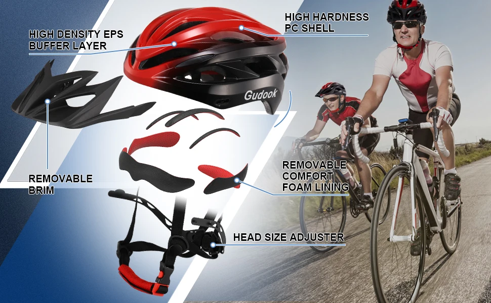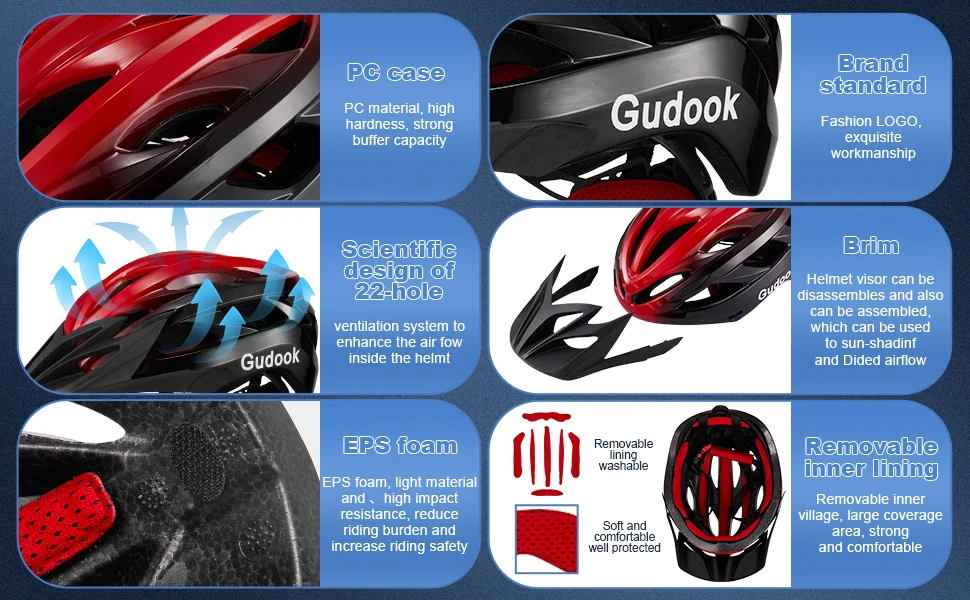 Gudook adult One-piece molding bicycle helmet, made of thickened High-density EPS buffer layer inner shell and PC outer shell, shock absorption, high impact resistance, provide higher safety performance and meet the US CPSC ASTM bicycle helmet safety standard. And holds the CE certificate issued by the EU NB agency.