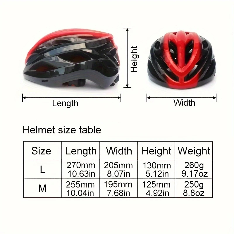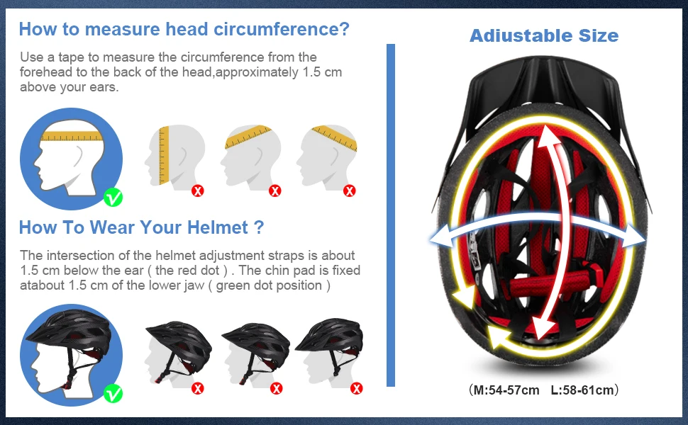 bike helmets for men/women are fully adjustable to fit the head circumference size (M) 53-57cm/20.86-22.44 inches, (L) 57-61cm/22.44-24.1 inches, provided by the adjustment dial, thickened chin pad, and adjustable length chin strap to make it Comfortable fit and comfortable to wear.