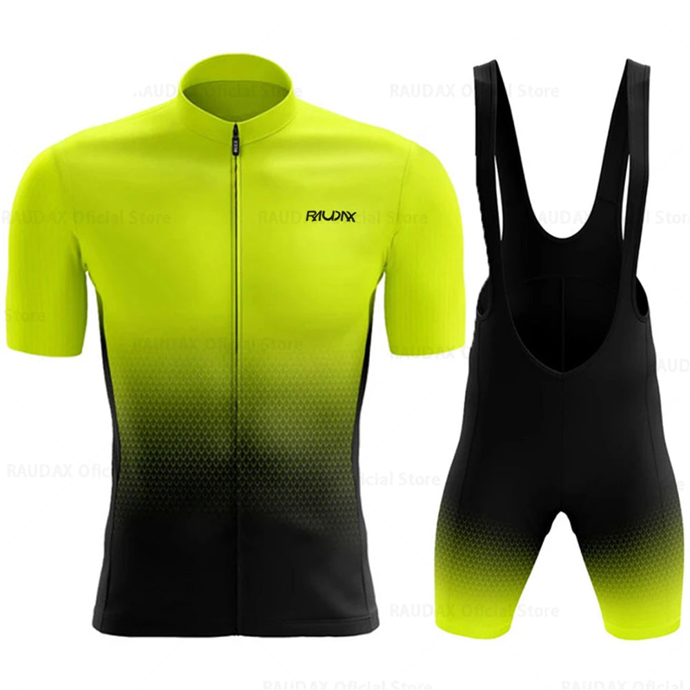 The bib shorts come with a 3D padded cushion crafted to absorb shock and reduce friction, ensuring all-day comfort on long-distance rides. Anti-slip silicone grippers keep everything securely in place, allowing you to focus entirely on your performance. With its sleek gradient color design, this set not only performs exceptionally but also makes a bold style statement.